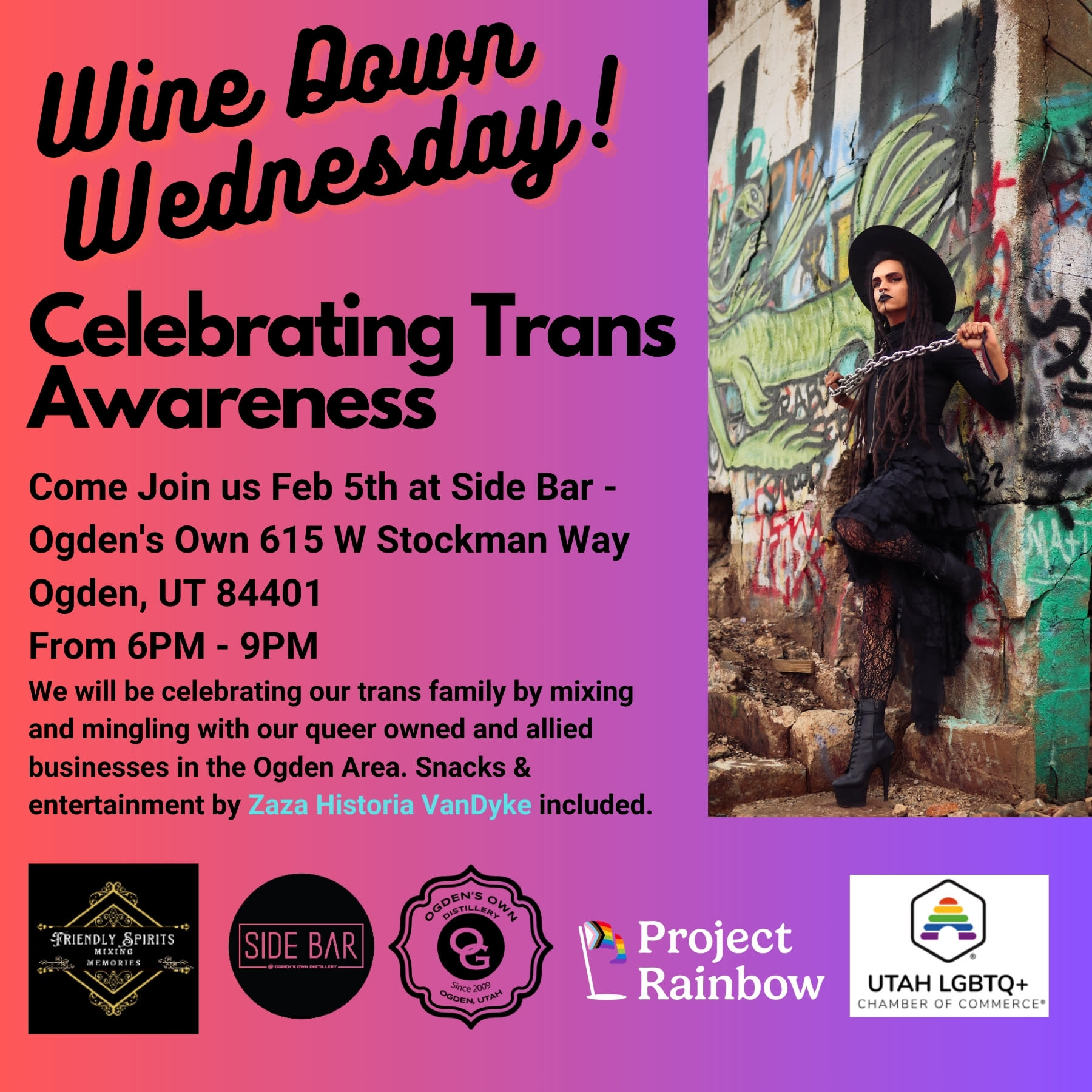 Join us for an incredible networking time and celebrate Trans individuals in the Ogden community. The trans family and queer-owned and ally businesses from the surrounding area will also enjoy a performance by Zaza Historia Vandyke (She, Her)!